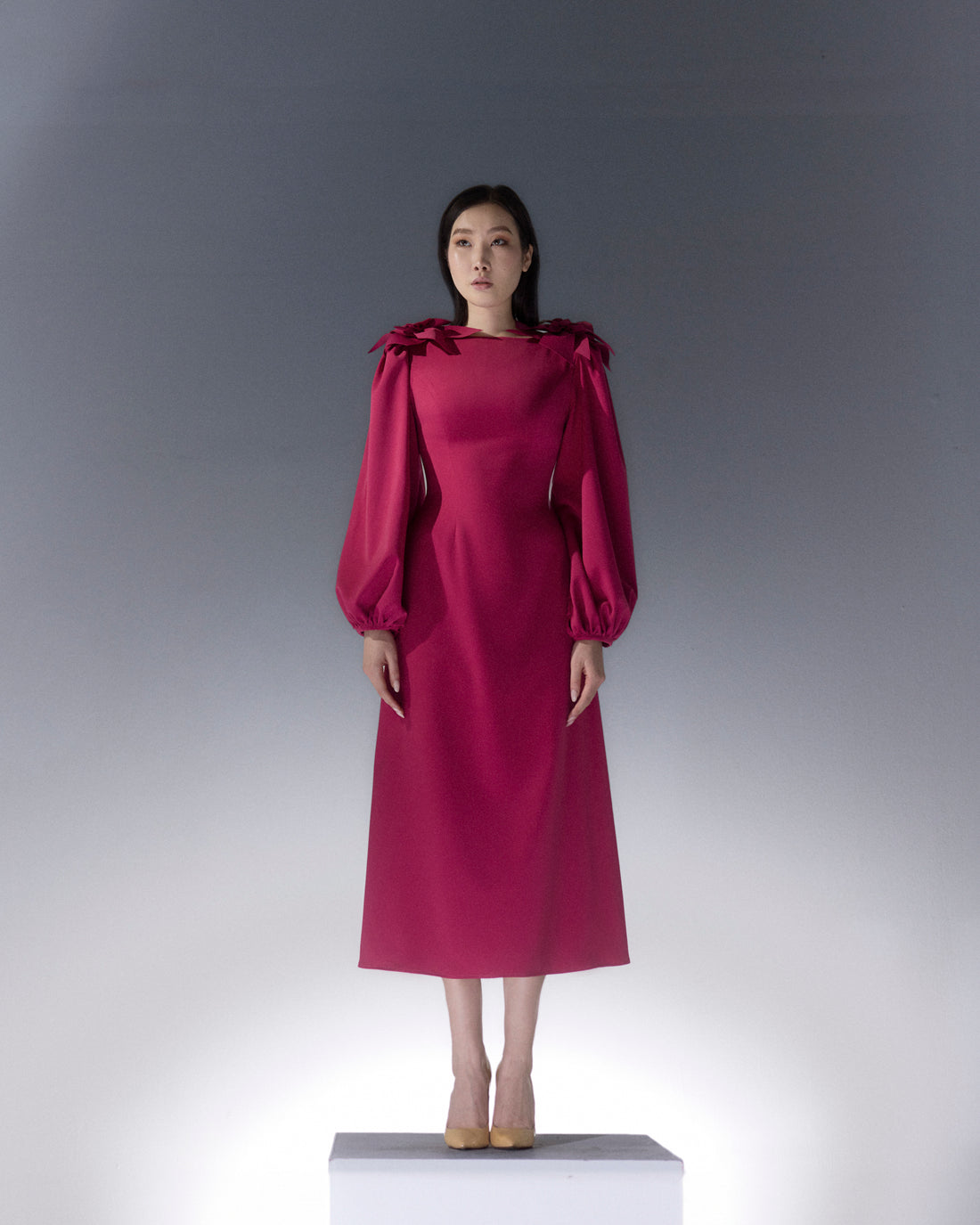 Dress : Statement dress featuring delicate laser-cut floral on both shoulders. Designed with extravagant balloon...