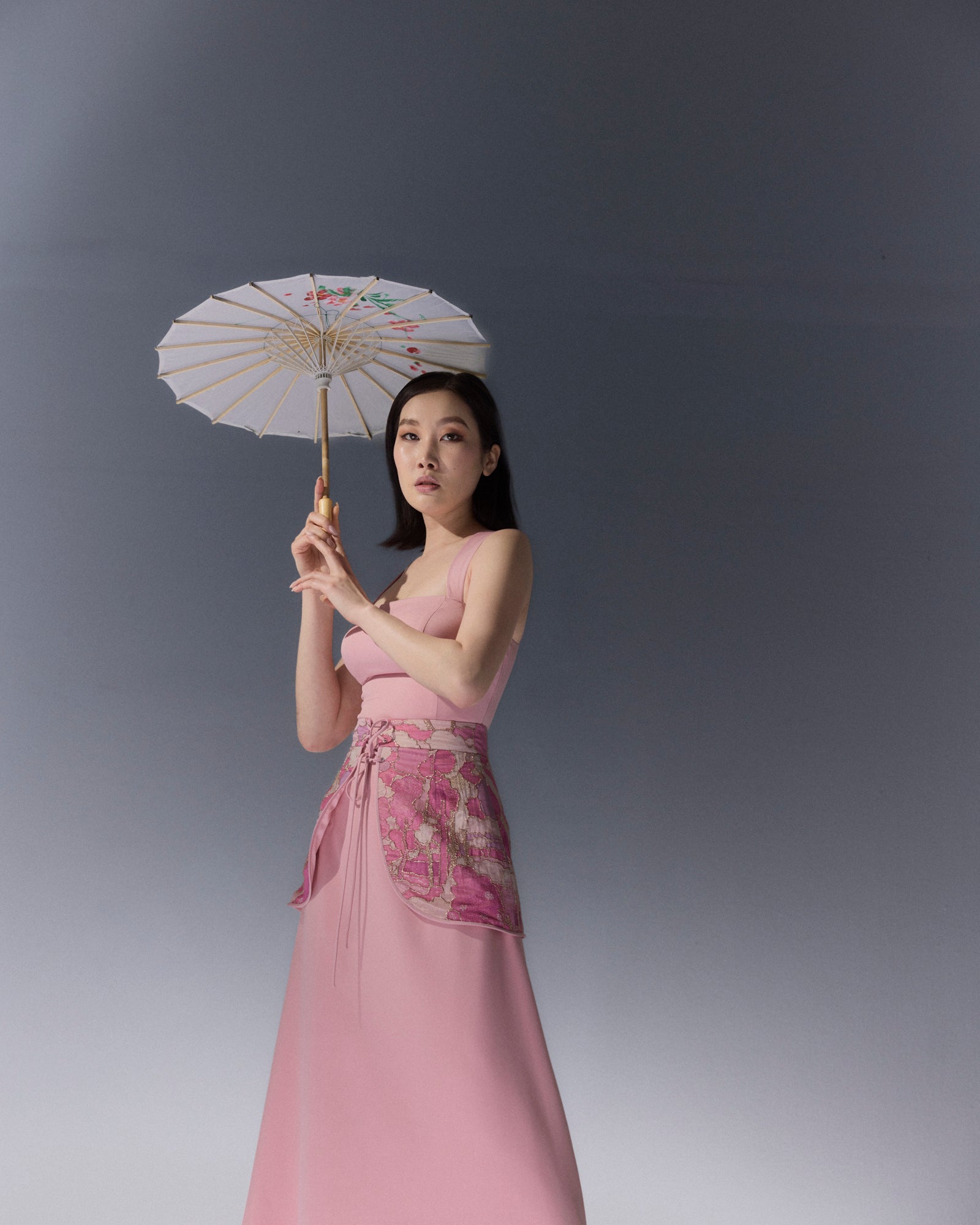 Corset belt: Peplum waist belt in embroidered jacquard, enhancing the silhouette with a structured yet feminine touch.