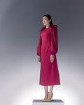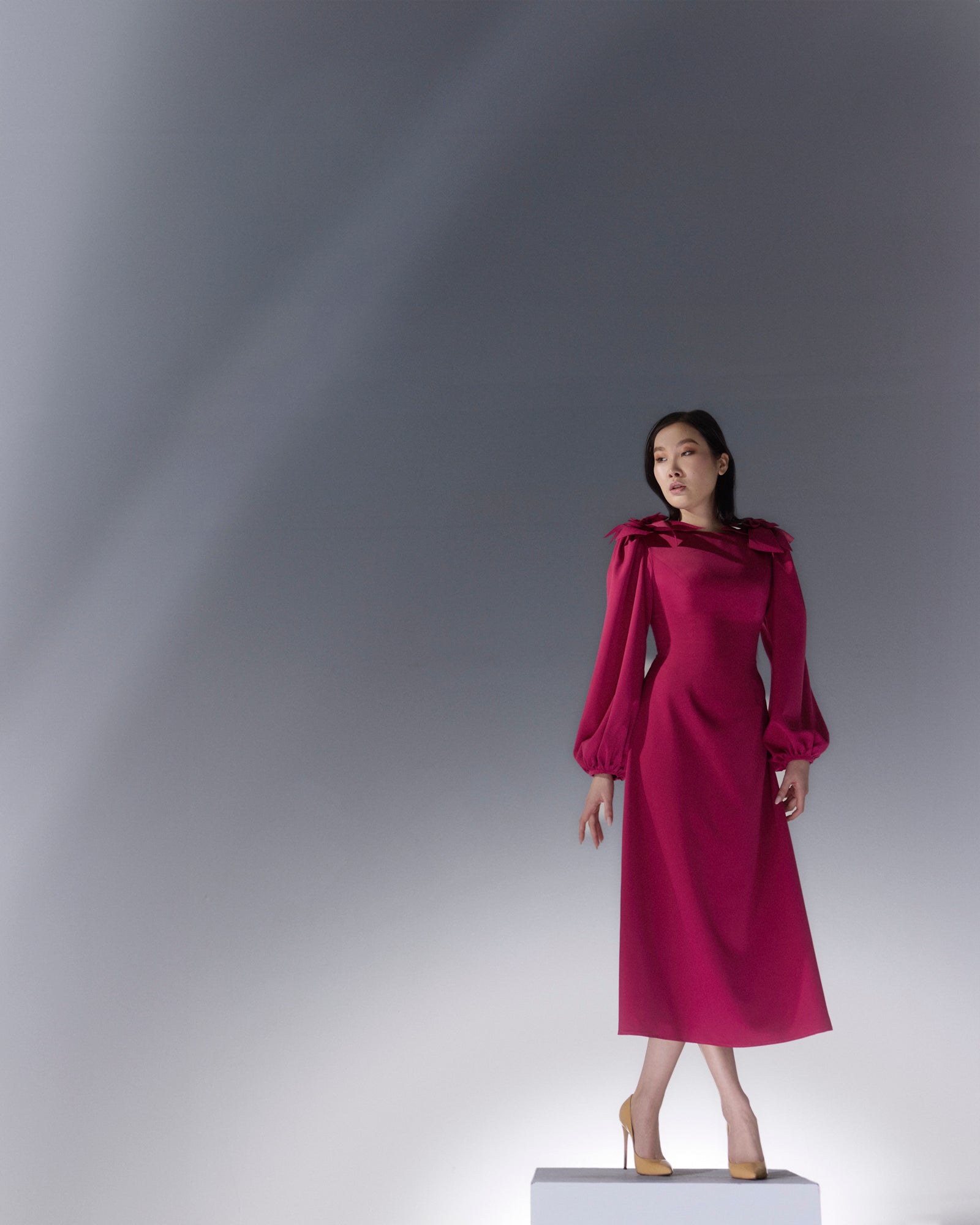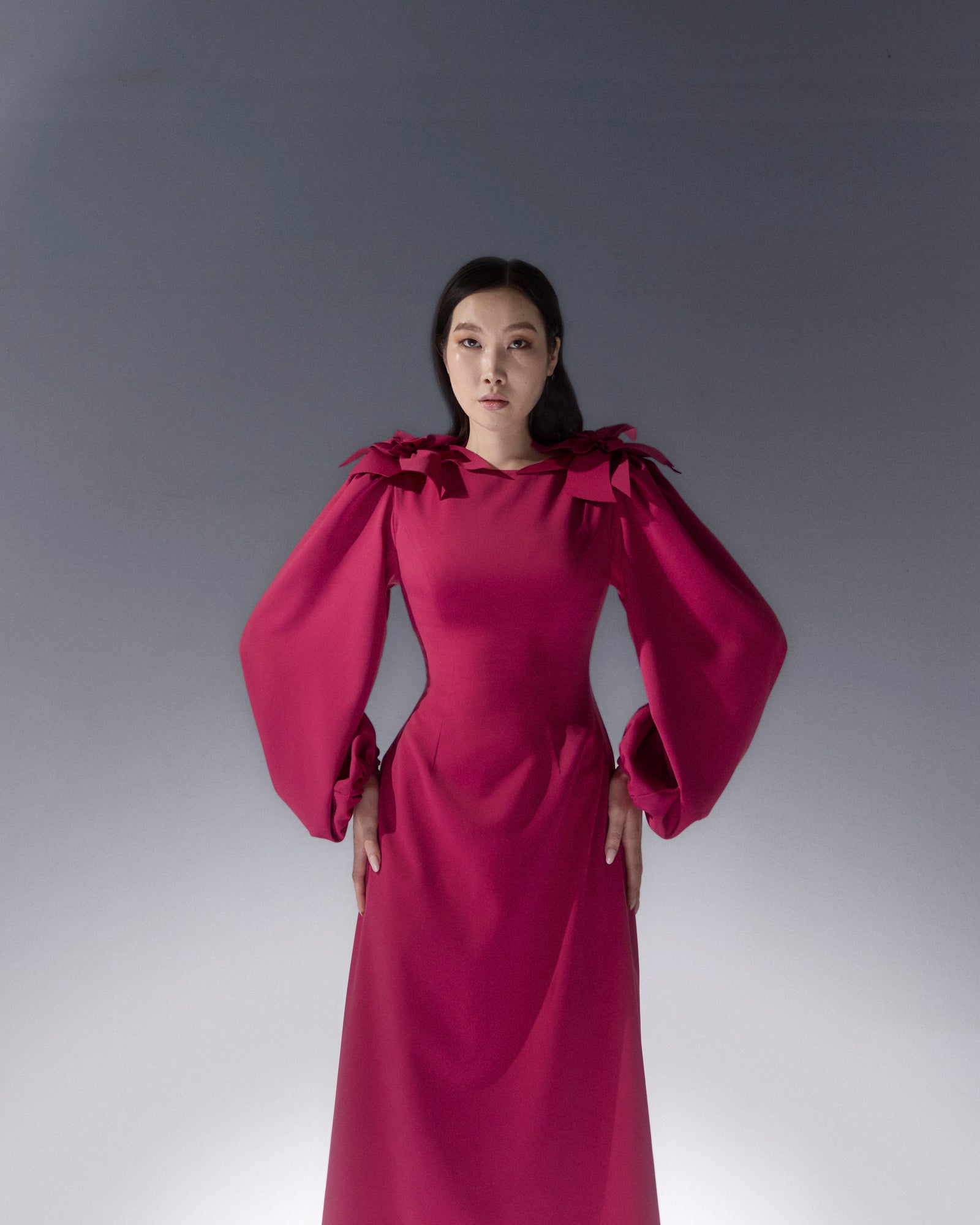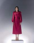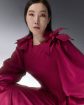 Dress : Statement dress featuring delicate laser-cut floral on both shoulders. Designed with extravagant balloon sleeves, creating a graceful and voluminous silhouette.